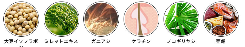 [原材料] ノコギリヤシ果実エキス油、サフラワー油、ミレットエキス末、亜鉛含有酵母、発酵黒生姜末、ガニアシエキス末、ケラチン加水分解物、大豆胚芽抽出物、黒胡椒抽出物、ゼラチン、グリセリン、ミツロウ、グリセリン脂肪酸エステル、カラメル色素